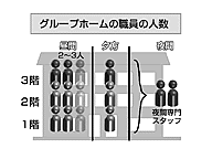 | ◆解説9:グループホームの職員人数 クランパレガータンの老人性痴呆症のグループホームでは、図3のような職員配置で、職員は24時間体制で勤務している。 図3 クランパレガータンのグループホームの職員配置■関連項目 グループホーム |