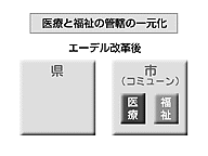 | ◆解説10:エーデル改革 スウェーデンでは、80歳以上の後期高齢者が増加し、高齢者医療の経費が膨大になった。 病院では、すでに治療が終了しても、病院にとどまるケースが多く出現した。これは在宅では充分な介護を受けられないこと、また病院では自己負担率が低く、在宅よりも経済的に有利であることが関連していた。また痴呆性老人の責任が不明瞭であったために、医療を担当する「県」と福祉を担当する「市」の間でたらい回しにされるケースも少なくなかった。 後期高齢者の場合、初期医療と福祉に明確に分けられるものではない。高齢者医療費の増大を押さえ、高齢者の医療と福祉への責任を明確にするためにエーデル改革(delreformen)が行なわれ、医療(一部)と福祉の管轄は「市」に一元化された。これにより、医療中心から予防・生活援助への転換がはかられ、市民がより効率的なニーズに応じたサービスを受けられるようになった。 しかし、全ての「市」において、エーデル改革がすぐに実行されたわけではない。福祉の最高責任者となった「市」の医療経験や能力の不足などの理由から、改革が遅れた「市」もあった。 エーデル改革によって、教育方針の違いなどで、医療サイドと福祉サイドの間で摩擦が生じている。現在は、医療専門責任看護婦(MAS)を採用するなど、努力が払われている。 図4 医療と福祉の管轄の一元化■関連項目 エーデル改革とケアつき住宅 |