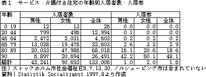 | ◆解説11:サービス・介護つき住宅の入居者 サービス・介護つき住宅に住んでいる人は、1996年12月の時点で約133,000人である(ノルシューピング市を除く)。入居者の変化をみると1993年は129,400人であるが、1995年にはそれより6,500人増加。1996年は前年度より約2,400人減少。しかしながら1996年はノルシューピング市が含まれていないため、実際には1,000人程の減少と推測される。 年齢別にみると80歳以上の入居者数は約94,500人。人口に占める入居者率を年齢別にみると80歳から89歳は18.6%、90歳以上になると48.1%に及んでいる。 ![]() 表1 サービス・介護つき住宅の年齢別入居者数・入居率 資料:Socialstyrelsen,1997, Statistik Socialtjanst ■関連項目 エーデル改革とケアつき住宅 |