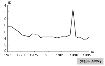 | ◆解説9:寡婦年金廃止とかけ込み結婚 スウェーデンの<男女平等>や<個人の経済的自立>の思想は社会保障システムへも影響を及ぼす。夫への収入依存を前提として設けられていた“未亡人”のための寡婦年金は1990年1月に廃止され、“残された配偶者”のための一時的年金という、“ジェンダー中立的”なものに改革された。 改革の移行措置として、1944年以前に生まれた1989年までに結婚していた女性は、これまでの寡婦年金を受ける権利が無条件に保障される。そのために、1989年の婚姻数は記録的に増加し、婚姻率も上昇する。 図2 婚姻率の推移資料:国際連合『世界人口年鑑』1982.1990.1995 ■関連項目 パートナー関係の変化と男性問題 |