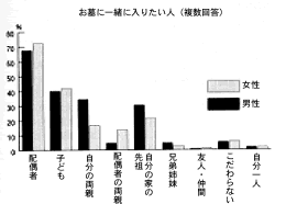 日本では、「無縁墓」の増加が問題に 近年日本の都市部では、深刻な墓地不足が生じている。一方、葬られた死者を弔うべき縁故者がいなくなった「無縁墓」を改葬合祀して墓地を整理するには「墓地、埋葬等に関する法律施行規則」第3条の規定で、下記の3要件とその墳墓の写真または図面が必要。無縁墓の改葬は、手続きが厳格な為、現実的になかなか進まない。 1.墳墓の土地の使用に関する権利が相当法令の規定に基づき公に消滅させられ、または、その消滅が公に確認されていること。 2.墓地使用者および死亡者の本籍地の市町村長に対して、その縁故者の有無を照会し、「無い」旨の回答を得ること。 3.墓地使用者及び死亡者の縁故者の申出を催告する旨を2種類以上の日刊新聞に3回以上公示し、その最終の公示から2カ月以内にその申出がなかったこと。 最近、墓地使用の期限を限定し、契約更新や継承者のない時には、別の場所に遺骨を移す方法をとる墓地も出てきている。 ■関連項目 埋葬権と管理義務 日本人は、お墓に誰と一緒に入りたいか 1998年2月、厚生省委託の「厚生科学特別研究事業」で実施された『墓地に関する意識調査』(主任研究者:森謙二、全国の20歳以上の男女を層化2段無作為法で対象者2,000人を抽出。回答者1,524人)では、「あなた自身は、お墓に誰と一緒に入りたいと思いますか」という質問に、「配偶者」と回答した割合がもっとも高く、次に多いのは「子ども」。「自分一人」や「親しい人」は、2%以下。男性は、女性よりも「先祖代々」「自分の両親」の回答が多く、「家」の墓の思考が強いことがうかがえる。 ![]() ■関連項目 ミンネスルンドの連帯・共同の哲学 |